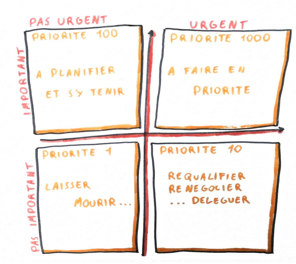 Et on termine sur une note plus classique. En effet, pour gagner du temps il faut aussi prioriser. Mais bien prioriser ! Et en cela, la matrice d’Eisenhower est un excellent outil. Elle permet de classer nos tâches en fonction de leur degrés d’urgence (en abscisse) et de leur niveau d’importance (en ordonnée). Apparaît ainsi ce qu’on doit traiter en priorité, ce qu’il faut planifier, déléguer, et ce qu’on peut laisser de côté.